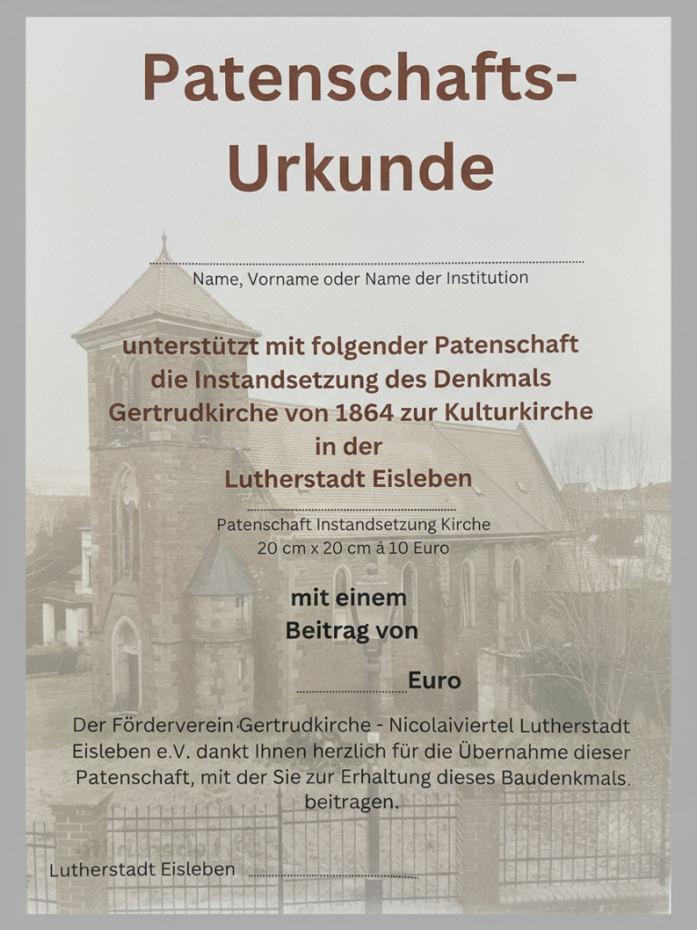 Jeder Beitrag zählt! Zeigen Sie Ihr Engagement für Eisleben und die Region – übernehmen Sie noch heute eine Patenschaft für die Gertrudkirche und helfen Sie, Geschichte zu bewahren.