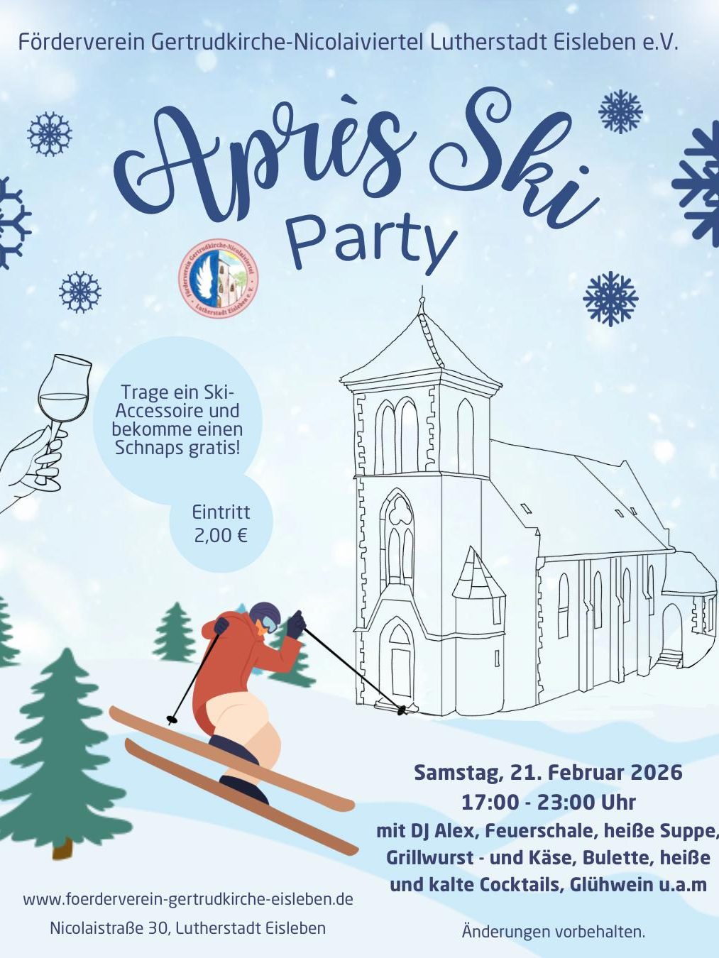 Die Après-Ski-Party des Fördervereins Gertrudkirche-Nicolaiviertel Lutherstadt Eisleben e.V. am Samstag, dem 21. Februar 2026, war ein voller Erfolg. Bei trockenem Winterwetter fanden zahlreiche Gäste den Weg in die Gertrudkirche und sorgten von 17:00 bis 23:00 Uhr für eine ausgelassene Stimmung.